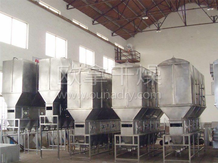 沸騰干燥,又稱流化床,它是由空氣過濾器、加熱器、沸騰床主機(jī),旋風(fēng)分離器,布袋除塵器、高壓離心風(fēng)機(jī)、操作臺(tái)組成,由于干燥物料的性質(zhì)不同,配套除塵設(shè)備時(shí),可按需要考慮,可同時(shí)選擇旋風(fēng)分離器、布袋除塵器,也可選擇其中一種,一般來說比重較大的如沖劑及顆粒料干燥只需選擇旋風(fēng)分離器,比重較輕的小顆粒狀和粉狀物料需配套布袋除塵器,并備有氣力送料裝置及皮帶輸送機(jī)供選擇。