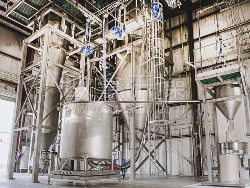 空氣經(jīng)過濾和加熱,進(jìn)入干燥器頂部空氣分配器,熱空氣呈螺旋狀均勻地進(jìn)入干燥室。料液經(jīng)塔體頂部的高速離心霧化器,(旋轉(zhuǎn))噴霧成極細(xì)微的霧狀液珠,與熱空氣并流接觸在極短的時(shí)間內(nèi)可干燥為成品。成品連續(xù)地由干燥塔底部和旋風(fēng)分離器中輸出,廢氣由風(fēng)機(jī)排空。